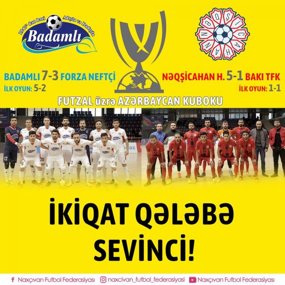 NUHÇIXAN xəbər verir ki, “Olimpik Star” İdman Kompleksində keçirilən oyunda əvvəlcə “Badamlı” komandası meydanda olub. Təmsilçimiz ilk oyunda “Forza Neftçi”ni 5-2 hesabı ilə üstələyib. İlk oyunda inamlı qələbə qazanan “Badamlı” cavab matçında rəqibin qapısından 7 top keçirtməyi bacarıb. “Forza Neftçi” isə bu qollardan 3-nün əvəzini çıxa bilib. Beləliklə 7-3 hesablı qələbə qazanan komandamız adını 1/8 final mərhələsinə yazdırıb. Komandamızın rəqibi yüksək liqa təmsilçisi “Neftçi İK” olacaq.