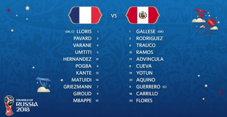 Fransalıların start heyətində Uqo Loris, Rafayel Varan, Samuel Umtiti, Benjamen Pavar, Luka Ernandes, Pol Poqba, Nqolo Kante, Antuan Qrizman, Blez Matuidi, Kilyan Mbappe, Olivye Jiru meydana çıxıblar. Peru millisində start heyətində isə Pedro Qalyes, Kristian Ramos, Alberto Rodriqez, Luis Advinkula, Miqel Trauko, Pedro Akino, Yosimar Yotun, Andre Karilyo, Edison Flores, Kristian Kuyevo, Paolo Qerrero yer alıblar.