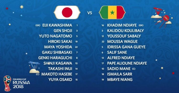 NUHÇIXAN xəbər verir ki, “Yekaterinburq Arena”da keçirilən görüşdə yaponiyalıların start heyətində meydana Eyndzi Kavasima, Qen Sendzi, Yuto Naqatomo, Qaku Sabasaki, Qenki Xaraquti, Sendzi Kaqava, Takasi Unui, Yuya Osaka, Makoto Xasebe, Xiroki Sakai, Maya Yosidaya çıxıblar. Komandanın baş məşqçisi Aliu Sissedi.
