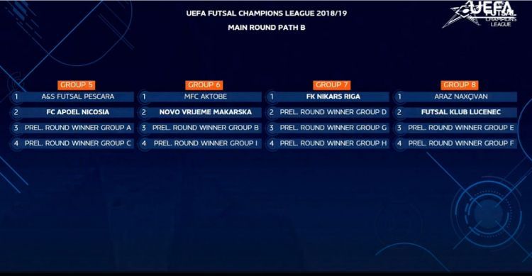 Təmsilçimizin rəqibləri “Luçenek” (Slovakiya), həmçinin ilkin raundun E və F qruplarının qalibləri olacaq. E qrupunda “Veles” (Makedoniya), “Futsamba Naas” (İrlandiya), “Valletta” (Malta), “Kosmos Tallinn” (Estoniya), F qrupunda isə “Hovokubo” (Hollandiya), “Ridinq” (İngiltərə), “Murata” (San Marino), “Vitis” (Litva) çıxış edəcək.