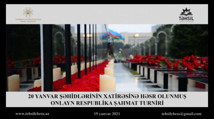 Yanvarın 19-da “Təhsil” Respublika İdman Mərkəzinin təşkilatçılığı ilə 20 Yanvar şəhidlərinin xatirəsinə həsr olunmuş onlayn formatda respublika şahmat turniri keçiriləcək.