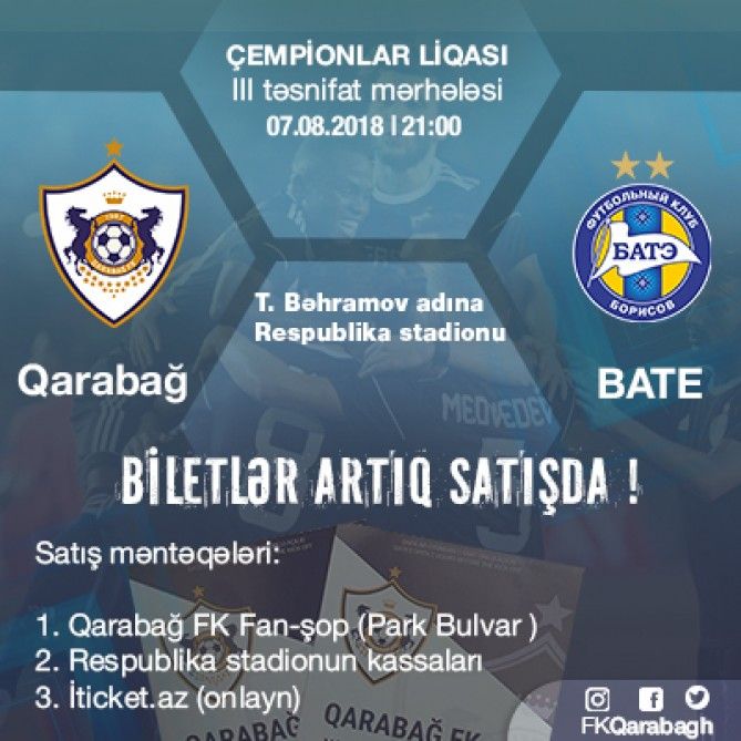Ağdamın “Qarabağ” futbol klubunun UEFA Çempionlar Liqasının III təsnifat mərhələsində avqustun 7-də Belarusun BATE komandası ilə keçirəcəyi ilk oyunun biletləri satışa çıxarılıb.