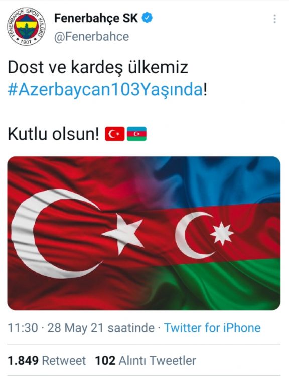 NUHÇIXAN İnformasiya Agentliyinin məlumatına görə, "Fənərbağça" futbol klubu bununla bağlı tvitter səhifəsində iki ölkə bayrağının fotosunu paylaşıb.