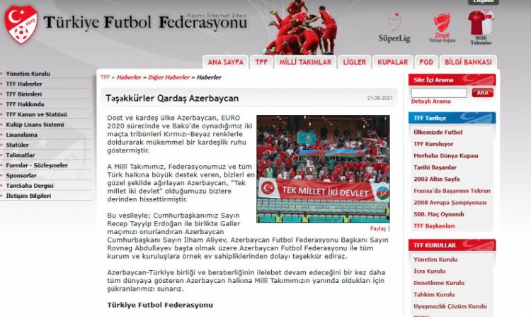 NUHÇIXAN İnformasiya Agentliyi xəbər verir ki, TFF-in rəsmi saytında yerləşdirilmiş müraciətdə qeyd olunub: “Dost və qardaş Azərbaycan “Avro-2020” zamanı və Bakıda oynadığımız iki matçda tribunaları “qırmızı-ağ” rənglərlə dolduraraq mükəmməl qardaşlıq ruhu göstərdi. Yığmamıza, federasiyamıza və bütün Türk xalqına böyük dəstək verən, bizi yüksək qonaqpərvərliklə qarşılayan Azərbaycan “Bir millət, iki dövlət” olduğumuzu bizlərə bir daha xatırlatdı”.