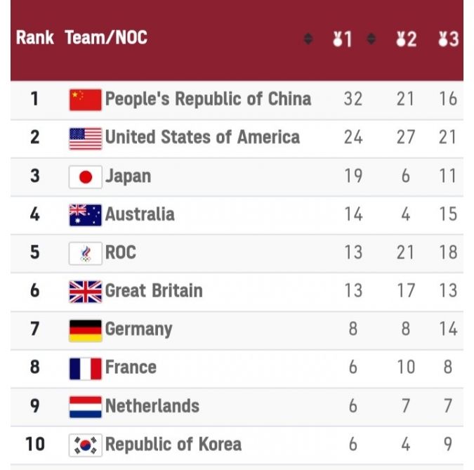 NUHÇIXAN İnformasiya Agentliyi xəbər verir ki, medal siyahısına Çin komandası liderlik edir. Bu ölkənin idmançıları 32 qızıl, 21 gümüş və 16 bürünc medal qazanıblar. İkinci pillədə 24 qızıl, 27 gümüş və 21 bürünc medalla ABŞ təmsilçiləri, üçüncü yerdə isə 19 qızıl, 6 gümüş və 11 bürünc medalla Yaponiya atletləri qərarlaşıblar.