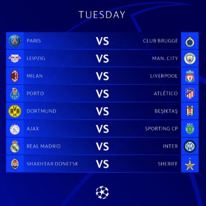NUHÇIXAN İnformasiya Agentliyi xəbər verir ki, ilk oyun günündə A, B, C və D qruplarında ümumilikdə 8 görüş keçiriləcək. Həmin görüşlərin ikisi – “Paris Sen-Jermen” – “Brügge” və “Leyptsiq” – “Mançester Siti” matçları saat 20:45-də, digərləri gecə saat 12-də başlayacaq.