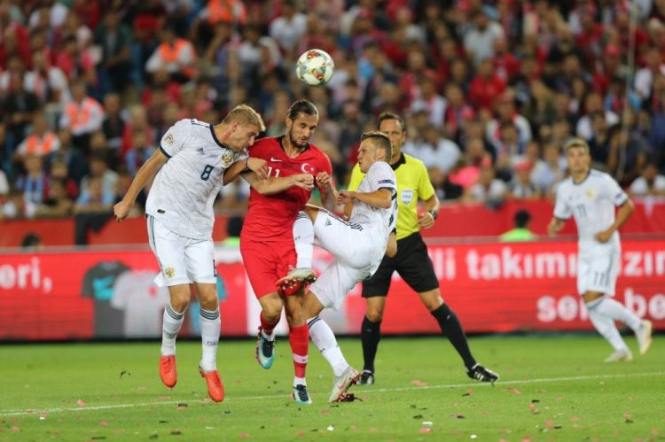 NUHÇIXAN xəbər verir ki, ikinci oyun gününün maraqla gözlənilən oyunu “Şenol Günəş Akyazı” stadionunda oynanılıb. “B” liqasının 2-ci qrupunda yer alan Türkiyə millisi Rusiya seçməsin qəbul edib. Oyunda hesabı ruslar açıblar. Kuzyayevin cinah ötürməsini sonra Denis Çerışev dəqiq zərbə ilə tamamlayıb. Qoldan sonra irəli atılan Mirça Luçeskunun yetirmələri fasiləyə qədər hesaba tarazlıq gətirə biliblər. Cərimə meydançasında Rusiya milli komandasının yarımmüdafiəçisi Yuri Qazinskinin qaytardığı topu Sərdar Əziz qüvvətli zərbə ilə qapıdan keçirdib. Birinci hissə 1:1 hesabı ilə başa çatıb.