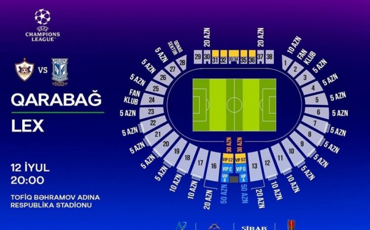 Ağdamın “Qarabağ” klubunun Bakıda Polşanın “Lex” komandasına qarşı keçirəcəyi UEFA Çempionlar Liqasının birinci təsnifat mərhələsinin cavab oyunu üçün biletləri satışa çıxarıb. NUHÇIXAN İnformasiya Agentliyi xəbər verir ki, qiymətlər sektorlara uyğun olaraq 5, 10, 20 və 50 manat təşkil edir. Biletləri "Iticket.az"ın satış məntəqələrindən (11:00-dan 20:00-dək) və onlayn şəkildə, həmçinin Ağdam təmsilçisinin “Park Bulvar”dakı fan-şopundan (11:00-dan 20:00-dək), matçın təşkil olunacağı Tofiq Bəhramov adına Respublika Stadionunun kassalarından əldə etmək olar. Mərkəzi arenanın kassalarında bilet satışı bu gün saat 15:00-da başlayacaq və 20:00-dək davam edəcək. Qeyd edək ki, iyulun 12-də oynanılacaq qarşılaşma saat 20:00-da başlayacaq. Komandalar arasında ilk görüş isə iyulun 5-də Poznanda keçiriləcək.