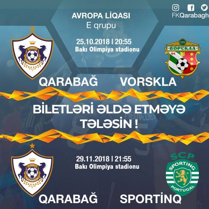 Ağdamın “Qarabağ” futbol klubunun UEFA Avropa Liqasının qrup mərhələsinin üçüncü və dördüncü turunda Ukraynanın “Vorskla” və Portuqaliyanın “Sportinq” komandaları ilə Bakıda keçirəcəyi oyunların biletləri satışa çıxarılıb.