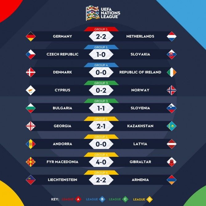 Turun mərkəzi qarşılaşması Almaniyada oynanılıb. A Liqasının 1-ci qrupunda Almaniya doğma meydanda Hollandiya ilə üz-üzə gəlib. Bundestim görüşün əvvəllərində iki qolla öndə olsa da, sonlara doğru qapısından eyni sayda top buraxaraq, qələbəni əldən verib. Bu heç-heçə nəticəsində Hollandiya qrup qalibinə çevrilib və pley-offa yüksəlib. Almaniya isə hələ ötən turdakı sonuncu yerin sahibi kimi B Liqasına enib.