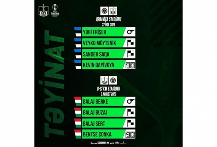 Avqustun 3-də saat 21:00-da “Bakcell Arena”da təşkil olunacaq cavab görüşünə isə Macarıstandan olan hakimlər təyinat alıblar. Baş hakim Balaj Berkeyə Balaj Buzaj və Balaj Sert kömək edəcəklər. Dördüncü hakim Bentse Çonka olacaq.