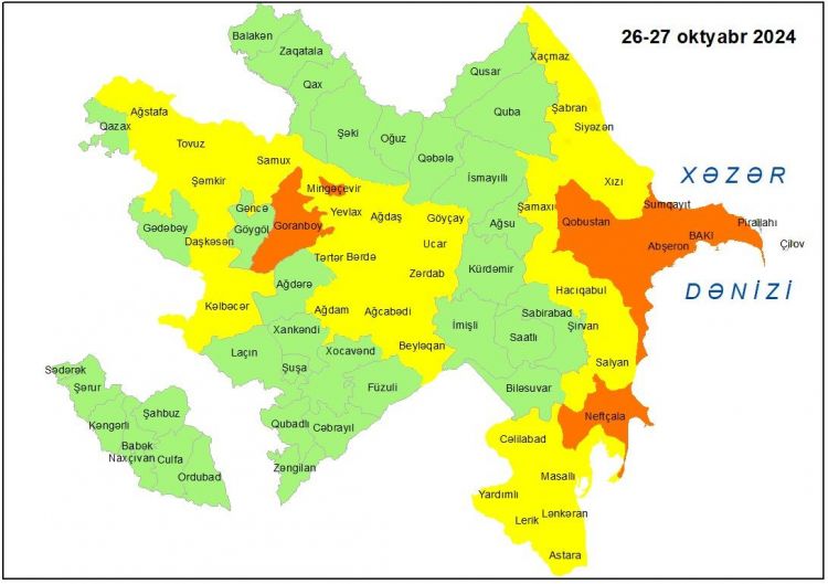 Bildirilib ki, Ağdam, Ağcabədi, Ağdaş, Ucar, Göyçay, Hacıqabul, Ağstafa, Şəmkir, Gəncə, Samux, Tovuz, Kəlbəcər, Astara, Lənkəran, Lerik, Yardımlı, Masallı, Salyan, Siyəzən, Xaçmaz, Xızı, Şabran, Tərtər, Bərdə, Beyləqan, Cəlilabad, Yevlax, Zərdab, Şamaxı, Daşkəsəndə fasilələrlə qərb küləyi əsəcək və küləyin sürəti 13.9-20.7 m/san təşkil edəcək. Bu, sarı xəbərdarlığa uyğundur.