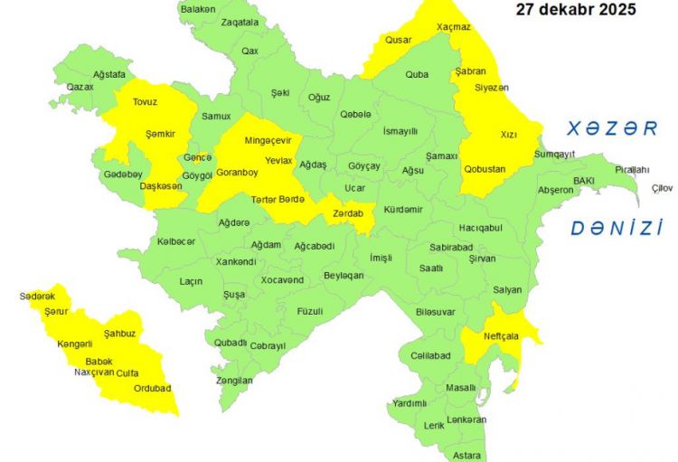 Milli Hidrometeorologiya Xidməti dekabrın 27-də bəzi rayonlarda gözlənilən küləkli hava şəraiti ilə bağlı sarı xəbərdarlıq verib.