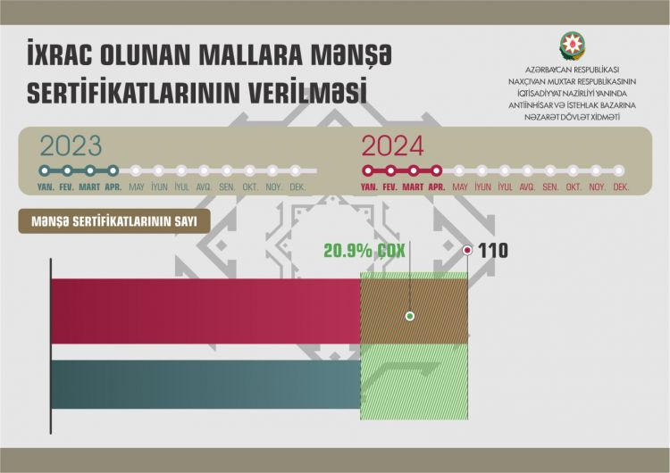 Naxçıvanda ixrac üçün nəzərdə tutulan məhsullara verilən mənşə sertifikatlarına tələbat artmaqda davam edir. Bu ilin yanvar-aprel aylarında Naxçıvan Muxtar Respublikasının İqtisadiyyat Nazirliyi yanında Antiinhisar və İstehlak Bazarına Nəzarət Dövlət Xidməti tərəfindən sahibkarlıq fəaliyyəti ilə məşğul olan şəxslərə 110 mənşə sertifikatı verilib.
