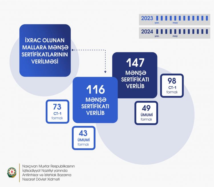 Bu ilin yanvar-may aylarında Naxçıvan Muxtar Respublikasının İqtisadiyyat Nazirliyi yanında Antiinhisar və İstehlak Bazarına Nəzarət Dövlət Xidməti tərəfindən sahibkarlıq fəaliyyəti ilə məşğul olan şəxslərə 147 mənşə sertifikatı verilib.