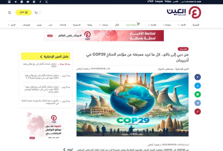 Ərəb ölkələrində geniş oxucu kütləsinə malik olan “Əl Ayn” nəşrinin elektron versiyasında jurnalist Mustafa Şabanın “Dubaydan Bakıya...Azərbaycanda keçiriləcək COP29 konfransı haqqında məlumatlar” sərlövhəli geniş məqaləsi dərc edilib.