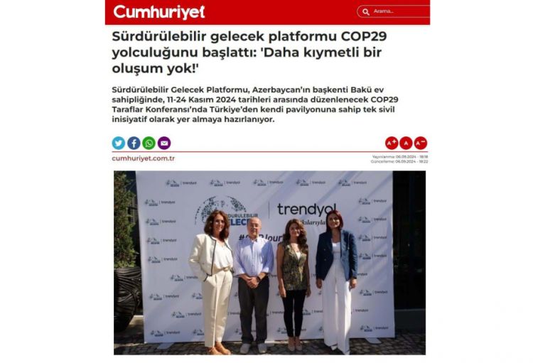 “Cümhuriyyət”in materialında, həmçinin “Dayanıqlı Gələcəyin” Məşvərət Şurasının üzvləri Əsli Pasinli və professor Levent Kurnaz, eləcə də Azərbaycan Kiçik və Orta Biznes Subyektləri və Klublarının Assosiasiyasının (KOBSKA) İdarə Heyətinin rəhbəri Nigar Ələsgərovanın Azərbaycanda keçiriləcək COP29 konfransının əhəmiyyəti mövzusunda fikirləri oxuculara çatdırılıb.