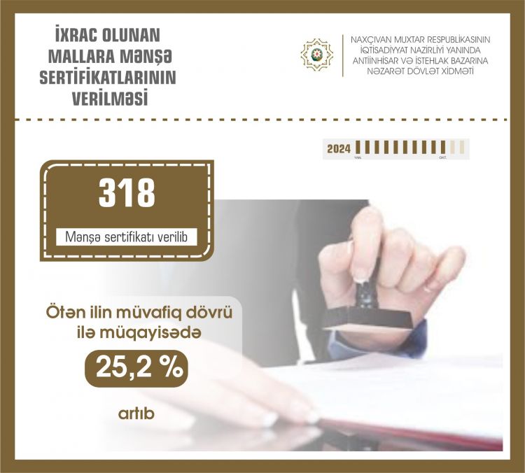 Bu ilin yanvar-oktyabr aylarında Naxçıvan Muxtar Respublikasının İqtisadiyyat Nazirliyi yanında Antiinhisar və İstehlak Bazarına Nəzarət Dövlət Xidməti sahibkarlıq fəaliyyəti ilə məşğul olan şəxslərə 318 mənşə sertifikatı verib.