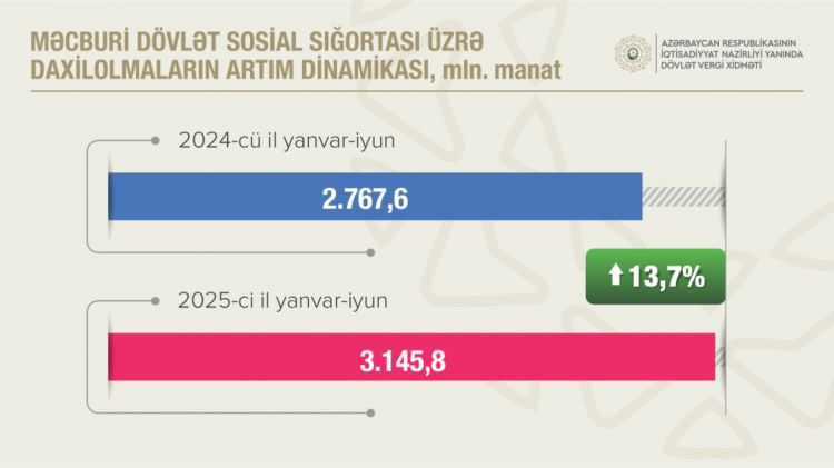 Cari ilin yanvar-iyun aylarında muzdlu işçi sayının və əməkhaqqı fondunun “ağarması” prosesi şəraitində məcburi dövlət sosial sığorta haqları üzrə daxilolmalar 3 milyard 146 milyon manata yaxın olub.