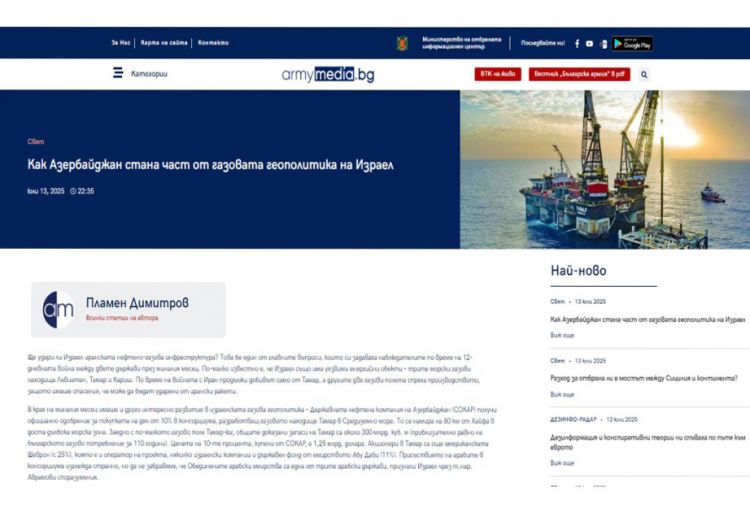 Bolqarıstan Müdafiə Nazirliyinin rəsmi media orqanı olan “ArmyMedia.bg” nəşrində siyasi şərhçi Plamen Dimitrovun SOCAR-ın İsrailin enerji sektoruna daxil olmasını təhlil edən “Azərbaycan necə İsrailin qaz geosiyasətinin bir hissəsi olub” sərlövhəli geniş məqalə dərc edilib.