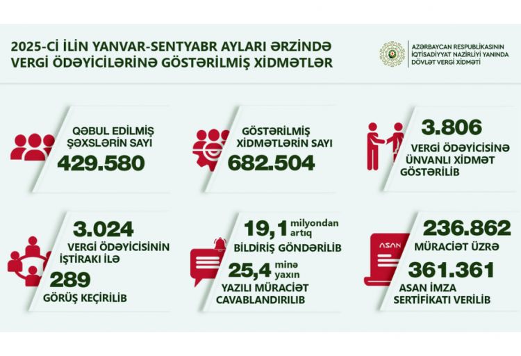 Cari ilin yanvar – sentyabr ayları ərzində vergiödəyicilərinə xidmət mərkəzlərində ümumilikdə 429 min 580 şəxs qəbul edilib, onlara 682 min 504 sayda xidmət göstərilib ki, bunun da 241 mindən çoxu şifahi (müraciət etmiş şəxslərin vergi qanunvericiliyi və inzibatçılığı ilə əlaqədar suallarının cavablandırılması), 150 mindən çoxu isə elektron (bəyannamələrin və hesabatların, habelə müxtəlif ərizələrin tərtibatına və elektron formada göndərilməsinə köməklik göstərilməsi) xidmətlər olub.