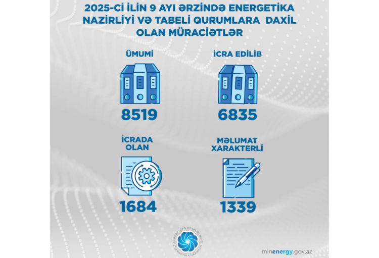 Cari ilin doqquz ayı ərzində Energetika Nazirliyi və tabeli qurumlara ümumilikdə 8519 vətəndaş müraciəti daxil olub.