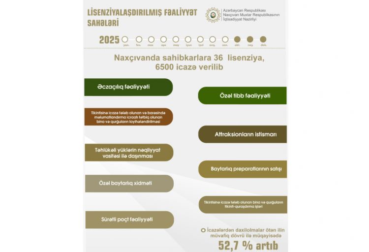 Məlumata görə, verilmiş lisenziyalar əczaçılıq, özəl tibb, tikintisinə icazə tələb olunan və barəsində məlumatlandırma icraatı tətbiq olunan bina və qurğuların layihələndirilməsi, attraksionların istismarı, təhlükəli yüklərin nəqliyyat vasitəsilə daşınması, baytarlıq preparatlarının satışı, özəl baytarlıq xidməti, tikintisinə icazə tələb olunan bina və qurğuların tikinti-quraşdırma işləri, sürətli poçt fəaliyyəti üzrə sahələri əhatə edib.