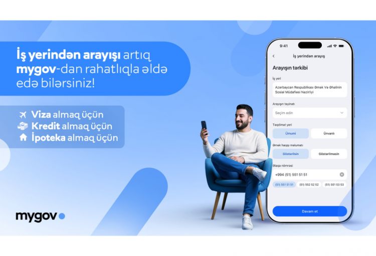 Yeni xidmət vətəndaşlara iş yerlərinə dair arayışı birbaşa “mygov”dan əldə etməyə imkan yaradır. Hazırlanmış sənəd elektron formatda (PDF) yüklənir və təqdimata hazır olur. Arayışı viza, kredit, ipoteka və ya digər rəsmi məqsədlər üçün təqdim edilə bilər.