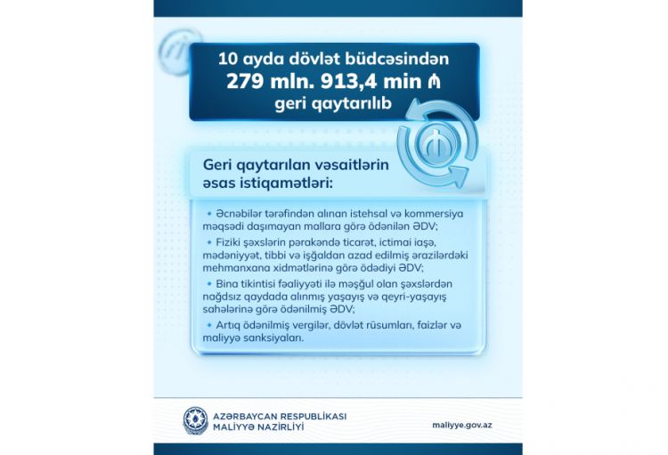 2025-ci ilin yanvar–oktyabr aylarında dövlət büdcəsindən fiziki və hüquqi şəxslərə ümumilikdə 279 milyon 913,4 min manat məbləğində vəsait geri qaytarılıb.