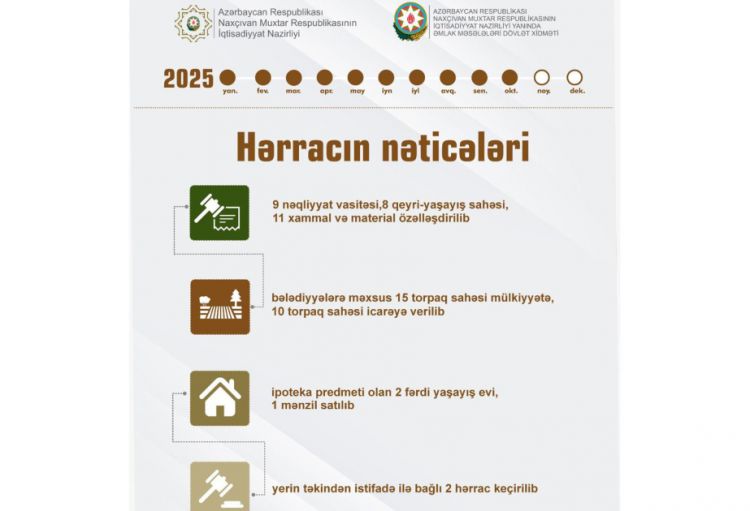 Bu ilin yanvar–oktyabr ayları ərzində Naxçıvan Muxtar Respublikasında dövlət əmlakının özəlləşdirilməsi, bələdiyyə mülkiyyətində olan torpaq sahələrinin mülkiyyətə və icarəyə verilməsi, ipoteka predmeti olan əmlakın satışı və yerin təkindən istifadə ilə bağlı ümumilikdə 58 hərrac təşkil olunub. Hərraclar Naxçıvan Muxtar Respublikasının İqtisadiyyat Nazirliyi yanında Əmlak Məsələləri Dövlət Xidmətinin tabeliyində fəaliyyət göstərən “Hərracların Təşkili Mərkəzi” publik hüquqi şəxs tərəfindən şəffaflıq və rəqabət prinsipləri əsasında keçirilib.