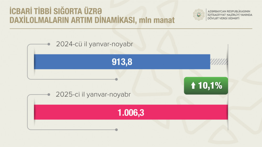 İcbari tibbi sığorta haqları üzrə daxilolmalar ötən ilin eyni dövrü ilə müqayisədə 10,1 faiz artaraq 1 milyard 6,3 milyon manat, qeyri-büdcə təşkilatları üzrə daxilolmalar isə 9,6 faiz artıb və 713,7 milyon manat təşkil edib.
