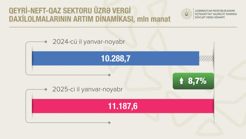 Qeyri-neft-qaz sektorundan daxilolmalar 11 milyard 187,6 milyon manat olub, proqnoz 102,7 faiz icra edilib. Ötən ilin müvafiq dövrü ilə müqayisədə bu sektordan vergi daxilolmaları 8,7 faiz artıb.