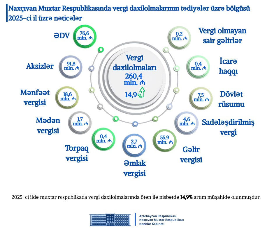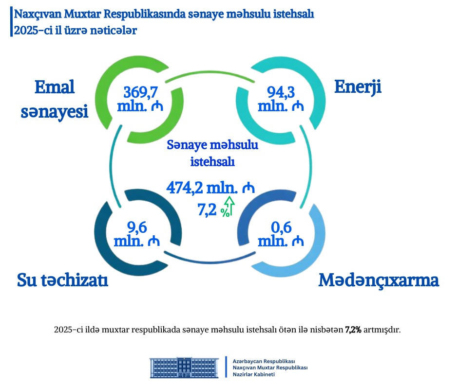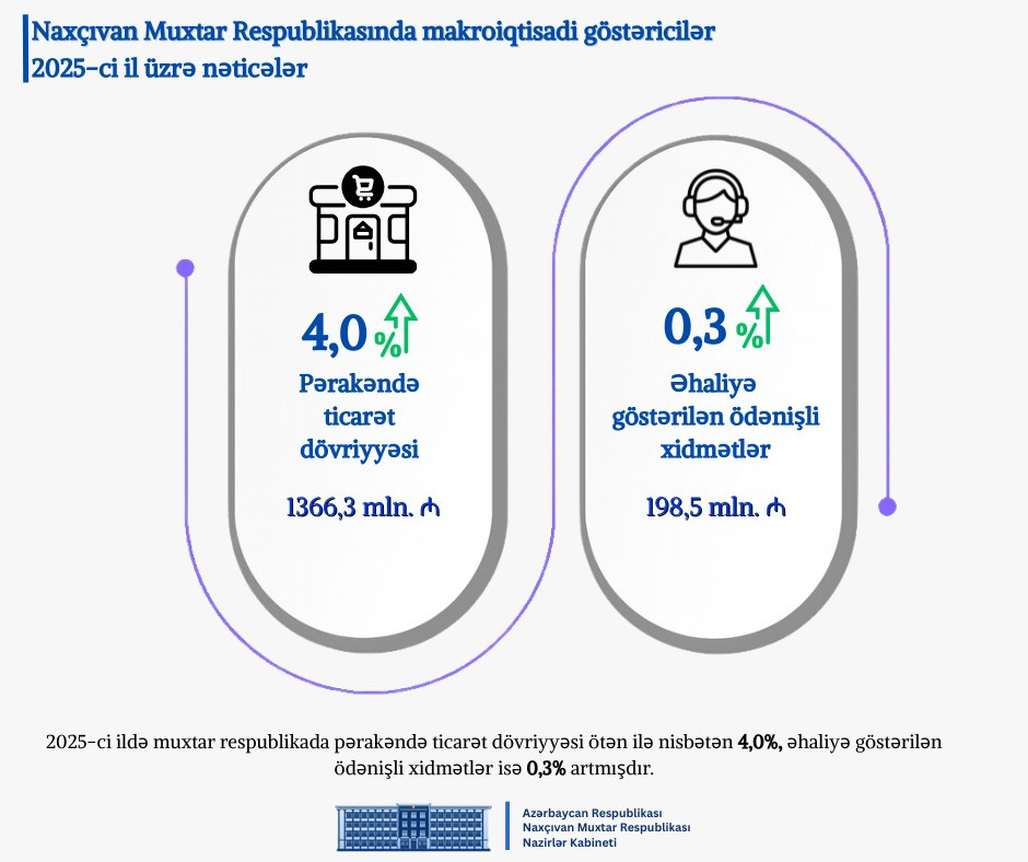 2025-ci ilin yekunlarına dair sosial-iqtisadi göstəricilər Azərbaycan Respublikasının Prezidenti cınab İlham Əliyevin məqsədyönlü və uzaqgörən siyasətinin, ölkədə ardıcıl şəkildə həyata keçirilən sosial-iqtisadi islahatların, regional inkişafın gücləndirilməsinə və investisiya mühitinin yaxşılaşdırılmasına yönəlmiş sistemli tədbirlərin Naxçıvan Muxtar Respublikasında iqtisadi fəallığın davamlı artımını təmin etdiyini nümayiş etdirir. Qeyd olunan dövrdə Ümumi Daxili Məhsulun (ÜDM) həcmi, büdcə və vergi daxilolmaları, ticarət və xidmətlər sektoru, sənaye, nəqliyyat, xarici ticarət, investisiya qoyuluşları, həmçinin sosial təminat və məşğulluq sahələri üzrə müsbət dinamika müşahidə olunmuşdur.