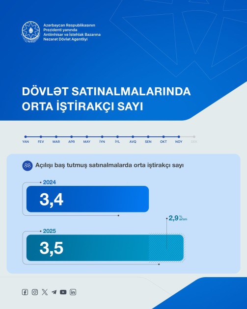 Bəhs edilən dövrdə açılışı baş tutmuş müsabiqələr üzrə orta təchizatçı sayı 3,5 təşkil edib. 2024-cü ilin müvafiq dövrü ilə müqayisədə açılışı baş tutmuş satınalmalarda orta iştirakçı sayı üzrə ümumilikdə 2,9 faiz artım qeydə alınıb.