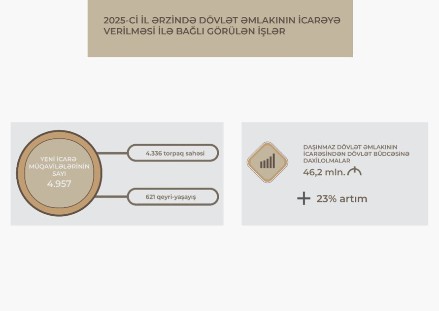 Dövlət əmlakının icarəyə verilməsi sahəsində də yüksək nəticələrə nail olunub. Belə ki, 2025-ci il ərzində 4957 yeni icarə müqaviləsi bağlanılıb ki, bunun 621-i qeyri-yaşayış, 4336-sı isə torpaq sahəsinə aiddir. Daşınmaz dövlət əmlakının icarəsindən ötən il dövlət büdcəsinə daxilolmalar 46,2 milyon manat təşkil edib. Bu, 2024-cü illə müqayisədə 8,6 milyon manat və ya 23 faiz çoxdur.