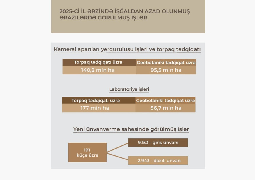 2025-ci il ərzində işğaldan azad edilmiş ərazilərdə torpaq tədqiqatı üzrə 140,2 min hektar, geobotaniki tədqiqat üzrə isə 95,5 min hektar ərazidə kameral işlər aparılıb. Bununla yanaşı, ümumilikdə 233,7 min hektar sahədə laboratoriya işləri yerinə yetirilib.