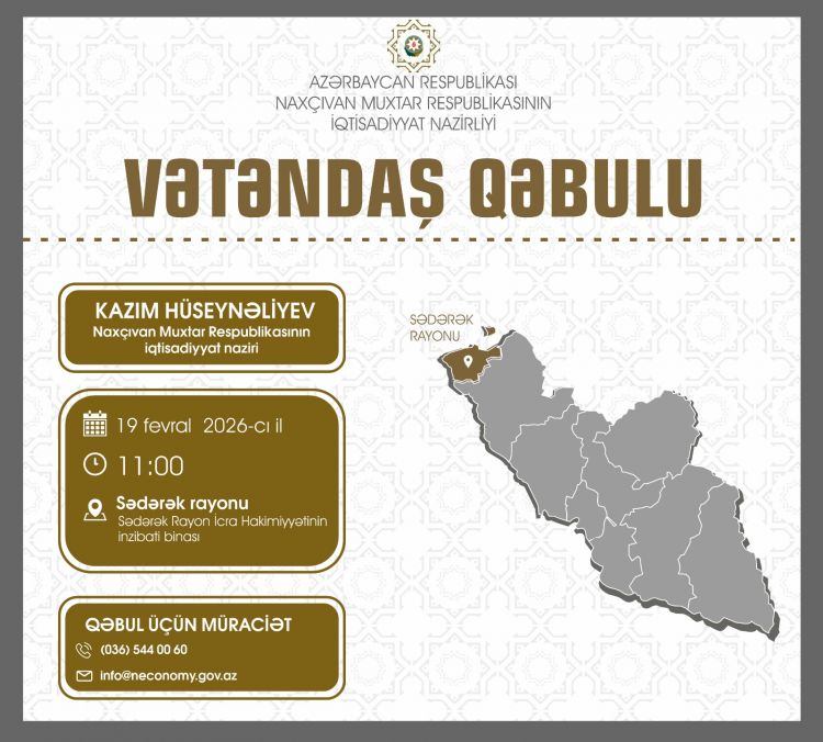 NUHÇIXAN xəbər verir ki, Naxçıvan Muxtar Respublikasının iqtisadiyyat naziri Kazım Hüseynəliyev fevralın 19-u Sədərək rayonu və kəndlərindən olan vətəndaşları qəbul edəcək.