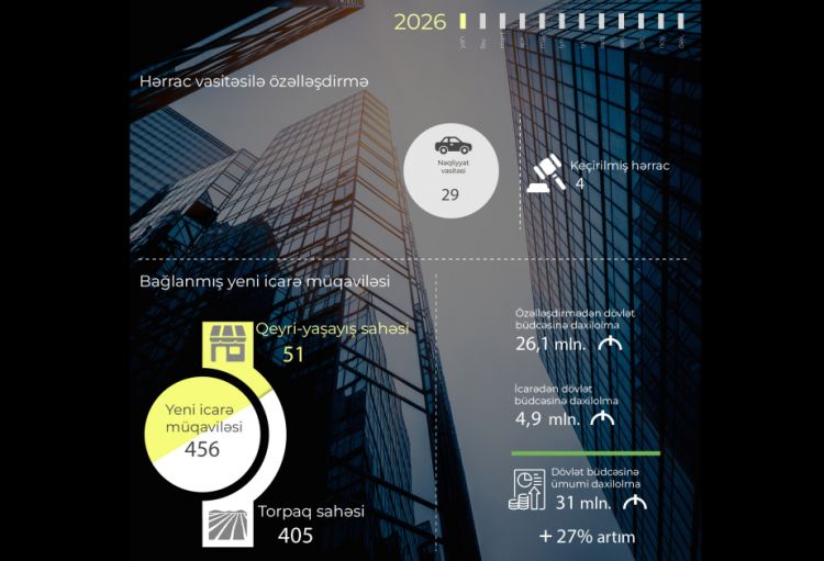 Beləliklə, 2026-cı ilin yanvar ayı ərzində dövlət əmlakının özəlləşdirilməsindən və icarəsindən büdcəyə ümumilikdə 31 milyon manat vəsait daxil olub ki, bu da 2025-ci ilin eyni dövrü ilə müqayisədə 6,5 milyon manata yaxın və ya 27 faiz artım təmin olunub.