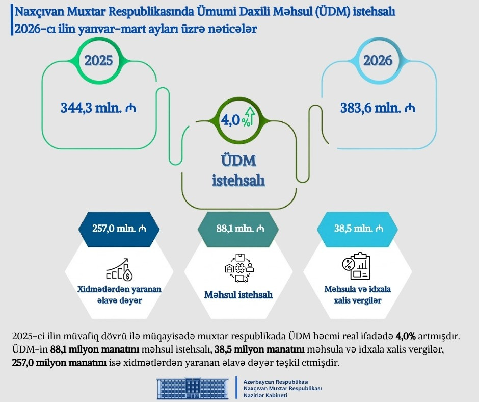Naxçıvan Muxtar Respublikası Nazirlər Kabinetinin mətbuat xidmətindən NUHÇIXAN-a verilən məlumata görə, hesabat dövründə ümumi daxili məhsulun istehsalı, sənaye, kənd təsərrüfatı, nəqliyyat, büdcə daxilolmaları, sahibkarlığa maliyyə dəstəyi və digər əsas istiqamətlərdə artım qeydə alınmışdır. Cari ilin birinci rübündə muxtar respublikada ümumi daxili məhsulun həcmi 383,6 milyon manat təşkil etmiş, bu da ötən ilin müvafiq dövrü ilə müqayisədə real ifadədə 4,0 faiz artım qeydə alınmışdır. ÜDM-in strukturunda 257,0 milyon manat xidmətlərdən yaranan əlavə dəyər, 88,1 milyon manat məhsul istehsalı, 38,5 milyon manat isə məhsula və idxala xalis vergilərin payına düşmüşdür.