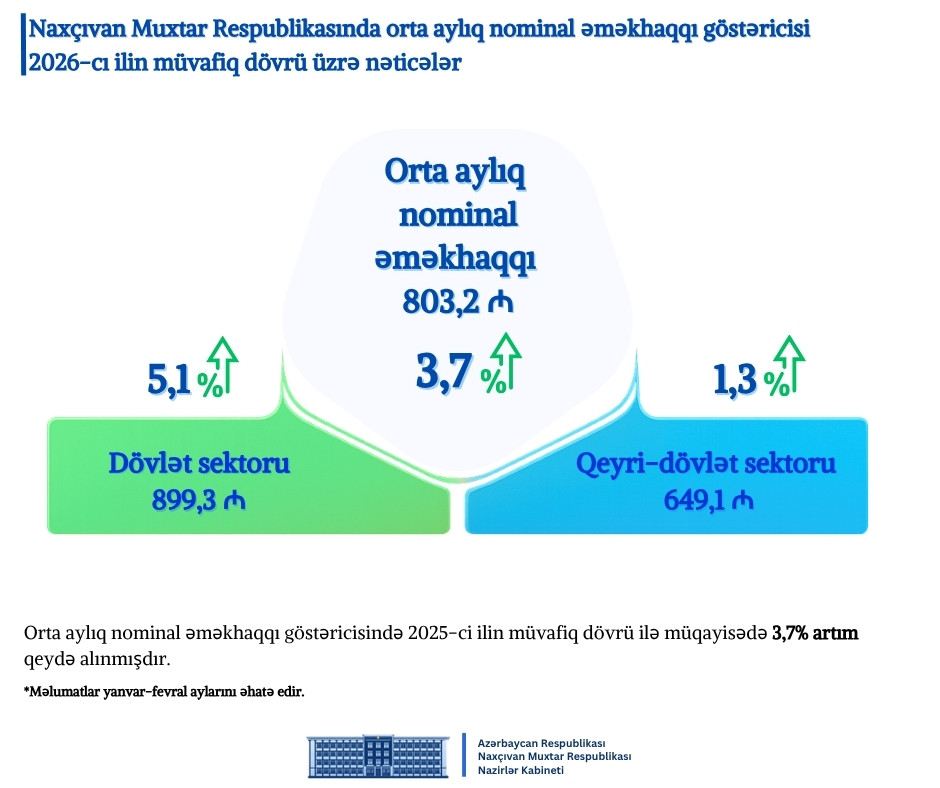 Muxtar respublikada əhalinin sosial rifahını əks etdirən əsas göstəricilərdən biri olan orta aylıq nominal əməkhaqqında da artım qeydə alınmış, cari ilin müvafiq dövründə orta aylıq nominal əməkhaqqı 803,2 manat olmuş, bu göstərici ötən ilin eyni dövrü ilə müqayisədə 3,7 faiz artmışdır. Sahibkarlığın inkişafı istiqamətində dəstək tədbirləri davam etdirilmiş, 2026-cı ilin birinci rübündə Sahibkarlığın İnkişafı Fondu tərəfindən 33 layihəyə ümumilikdə 1 milyon 611 min manat həcmində dövlət maliyyə dəstəyi göstərilmişdir. Sahibkarlara verilmiş kreditlərin həcmi ötən ilin müvafiq dövrü ilə müqayisədə 20,9 faiz artmışdır.