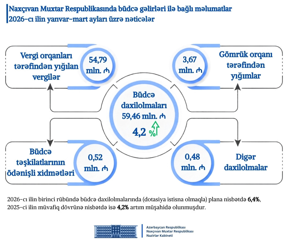Büdcə gəlirləri üzrə göstəricilər də artımla müşayiət olunmuşdur. 2026-cı ilin birinci rübündə büdcə daxilolmaları 59,46 milyon manat təşkil etmiş, bu göstərici ötən ilin müvafiq dövrü ilə müqayisədə 4,2 faiz artmışdır. Daxilolmaların 54,79 milyon manatı vergi orqanları tərəfindən yığılan vergilər, 3,67 milyon manatı gömrük orqanları tərəfindən yığımlar, 0,52 milyon manatı büdcə təşkilatlarının ödənişli xidmətləri, 0,48 milyon manatı isə digər daxilolmaların payına düşmüşdür.
