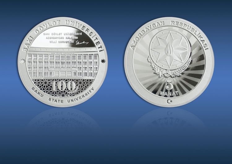Bakı Dövlət Universitetinin 100 illik yubileyinə həsr olunmuş yubiley pul nişanının ön tərəfində universitetin inzibati binasının təsviri, ümummilli lider Heydər Əliyevin kəlamı və imzası, 8 guşəli ulduzlar, milli naxış və ornamentlər, arxa tərəfində isə Azərbaycan Respublikasının Dövlət Gerbi və pul nişanının nominalı təsvir olunub.