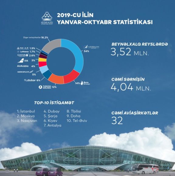 Cari ilin 10 ayında Azərbaycanın beynəlxalq hava limanlarında sərnişin axını 4,7 milyon sərnişin təşkil edib ki, bu da son illərin rekord göstəricisidir. Bunun 4 milyondan çoxu Heydər Əliyev Beynəlxalq Aeroportunun payına düşür və bu da ötən ilin göstəricisindən 200 min sərnişin çoxdur.