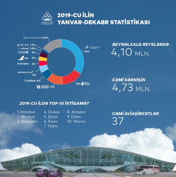 2019-cu il ərzində Heydər Əliyev Beynəlxalq Aeroportundan 37 sərnişin aviaşirkəti 60-dan çox müxtəlif istiqamətə uçuşlar həyata keçirib.