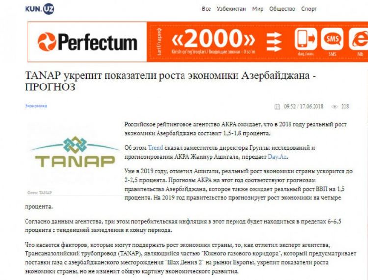 NUHÇIXAN xəbər verir ki, Daşkənddəki kun.uz portalında “TANAP Azərbaycanın iqtisadi göstəricilərini möhkəmləndirəcək” sərlövhəli məqalə yerləşdirilib.