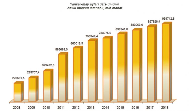 2018-ci ilin yanvar-may aylarında ümumi daxili məhsulun 54,8 faizi və ya 525 milyon 431 min 100 manatı məhsul istehsalından, 43,6 faizi və ya 418 milyon 615 min 700 manatı xidmətlərin istehsalından, 1,6 faizi və ya 15 milyon 666 min manatı isə məhsula və idxala xalis vergilərdən yaraıb. 2008-ci ilin müvafiq dövründə ümumi daxili məhsulun 42,1 faizi məhsul, 53,2 faizi xidmətlərin istehsalından, 4,7 faizi isə məhsula və idxala xalis vergilərdən yaranıb. 2008-ci ilin müvafiq dövrü ilə müqayisədə məhsul istehsalının artımı sənaye, kənd təsərrüfatı və tikinti sahələrində həyata keçirilən effektiv tədbirlər nəticəsində əldə edilib.