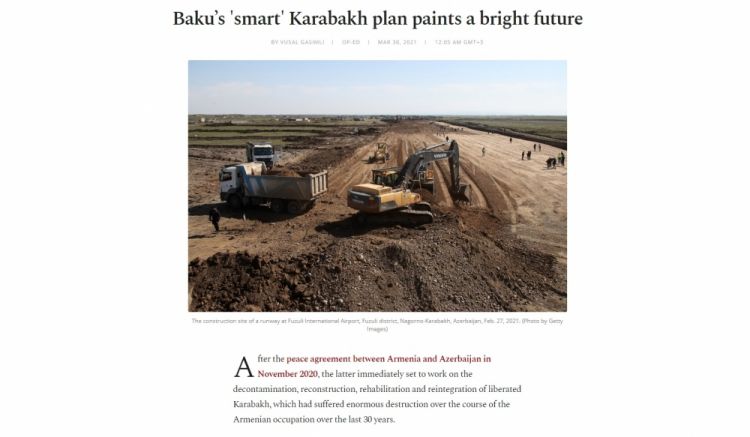 Türkiyənin “Daily Sabah” qəzeti İqtisadi İslahatların Təhlili və Kommunikasiya Mərkəzinin (İİTKM) icraçı direktoru Vüsal Qasımlının “Bakının Qarabağ üzrə "ağıllı" planı parlaq gələcək vəd edir” (Baku’s “smart” Karabakh plan paints a bright future) başlıqlı məqaləsini dərc edib.