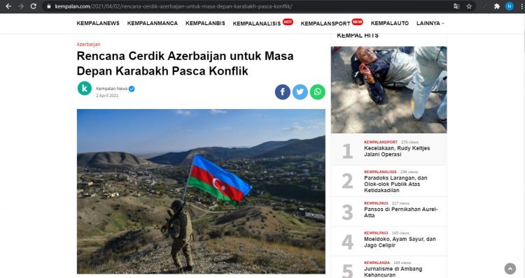 İndoneziyanın oxunaqlı xəbər saytı “Kempalan” Azərbaycanın Qarabağla bağlı inkişaf perspektivlərinə dair məqalə dərc edib.