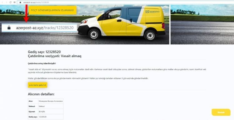 MMC-dən NUHÇIXAN İnformasiya Agentliyinə bildirilib ki, bir qrup kiberdələduz qeyri-qanuni yolla maddi vəsait əldə etmək məqsədilə “Azərpoçt”un rəsmi saytına oxşar saxta saytlar yaradır. Onların hədəfi onlayn alqı-satqı səhifələrində müxtəlif məhsulların satışını həyata keçirən vətəndaşlardır. Kiberdələduzlar alıcı qismində saxta “WhatsApp” nömrələrindən bu vətəndaşlara yazaraq məhsulu almaq istədiyini bildirir və ödənişin həyata keçirilməsi üçün satıcıdan “Azərpoçt” MMC-nin adına açılan saxta sayta daxil olaraq kart hesabı məlumatlarını daxil etməsini istəyirlər. Vətəndaş bu keçidə daxil olaraq kart hesabının məlumatlarını təqdim etdikdə hesabın balansında olan vəsait kiberdələduzların əlinə keçir.