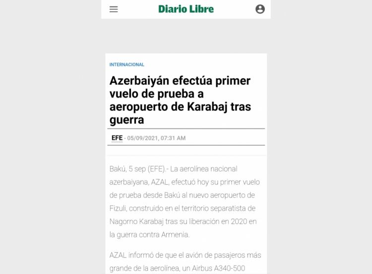 İspaniyanın EFE xəbər agentliyinin saytında və Latın Amerikasının “Diariolibre” onlayn nəşrində müharibədən sonra Azərbaycan aviaşirkəti tərəfindən Qarabağa həyata keçirilən ilk sınaq reysi barədə yazılar dərc olunub.